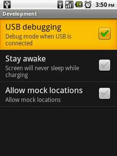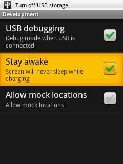 En su teléfono Android, vaya al menú > Ajustes > Aplicaciones > desarrollo y selecciona "Depuración USB" y "Mantenerse despierto"; Esto evitará que el teléfono apagado mientras está conectado, y depuración USB le permitirá hacer funcionar el teléfono Android mientras está conectado con su computadora.