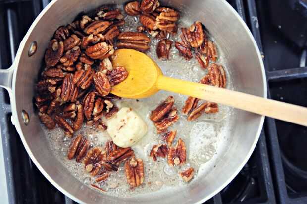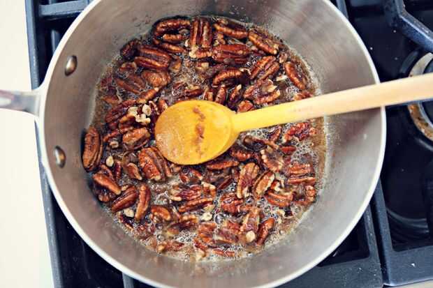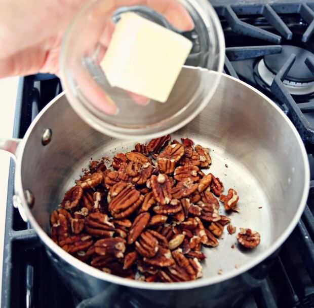 Después las nueces han sido pan frito, mezclar con la mantequilla y revolver para que todas las tuercas están bien recubiertas.