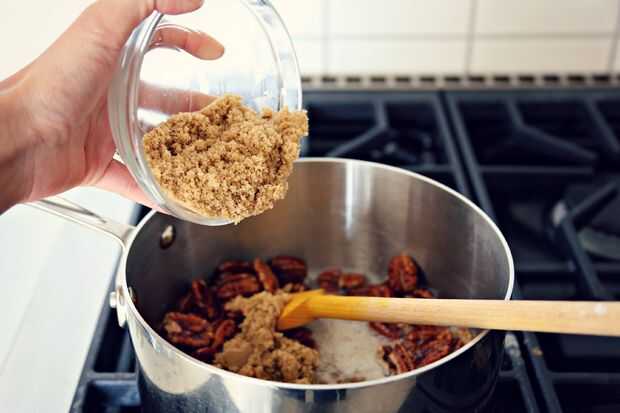 Agregue el azúcar morena y mantenga las tuercas para que quemar ni la mantequilla ni el azúcar. Esto debe tomar no más de 5 minutos.