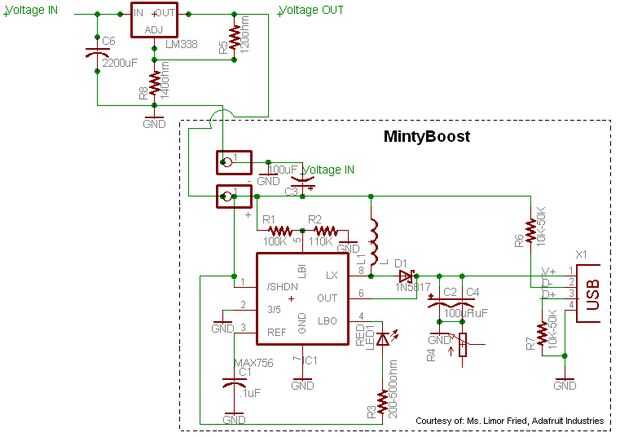 El circuito que hemos diseñado complementa la función del cargador MintyBoost USB, originalmente desarrollada por Limor Fried, industrias Adafruit. El MintyBoost utiliza baterías AA para cargar dispositivos electrónicos portátiles. Nuestro circuito independiente construido reemplaza las pilas AA y suministra energía a la MintyBoost. Este circuito reduce los ~ 6 voltios del motor a 2,5 voltios. Esto permite que el motor cargar la BoostCap (140 F), que a su vez suministra energía a los circuitos de MintyBoost. Los ultracondensadores almacena energía para cargar continuamente el dispositivo USB aunque la moto no está en movimiento.