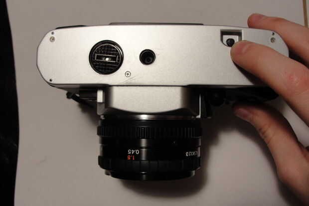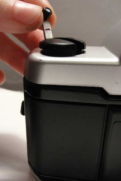 Una vez que hayan terminado el rollo de película, debe rebobinar en el frasco. Para rebobinar la película, presione el botón de liberación de la película en la parte inferior de la cámara. Extraiga la manivela de rebobinado de película y gire en la dirección de la flecha hasta que no se sienta más tensión de la perilla.