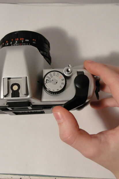 Asegúrese de que los dientes están correctamente colocados a ambos lados de la película. Use el botón de rebobinado tomar cualquier holgura en la película, apretar la película a la cámara. Luego cerrar la parte posterior de la cámara y utilizar el avance de la película a la película.