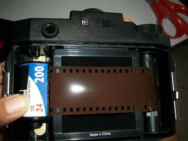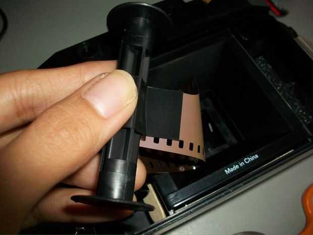 7) montar la película de 35 mm en el compartimento de la película de tu Holga.