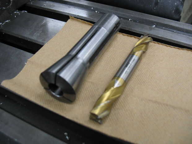 Primero, tenemos nuestro molino de extremo doble flauta 4 (1/2", en este caso) y una boquilla R8 1/2" para que coincida con. Boquillas R8 tiene una gama bastante pequeña de agarre, así que asegúrese de que usted no está tratando de exprimir una boquilla de 3/4" hasta agarre una herramienta de 5/8", por ejemplo! Una boquilla de tamaño apropiada 'solo' debe deslizarse sobre la herramienta. También, nunca utilizar un portabrocas para el fresado. Mandriles no soportar las cargas laterales de molienda y aflojar para arriba y posiblemente del resbalón o expulsar su corte mientras está en uso... Piense lo emocionante puede ser!