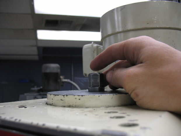 Bien, ahora está limpio, surge ese collar en el eje y sostenerla con una mano (usar mi izquierda para sostener allí, creo que es un alcance más fácil de la barra de tracción en el paso siguiente de esta manera). Alcanzar con la otra (derecha, en mi caso) de la mano y girar los hilos de tracción por un par de vueltas en el mandril, capturándolo y evitando que se caiga. No girar completamente hacia abajo todavía, o no podrás conseguir el cortador en!