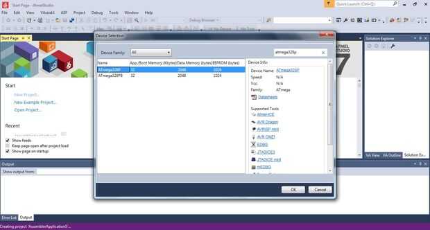 Estamos listos para ir, todo lo que necesitamos hacer es hacer una pequeña prueba. Así que haga clic en archivo/nuevo/proyecto y seleccione "AVR assembler proyecto bajo la opción de"Ensamblador". Haga clic en aceptar y seleccione ATMEGA328P, haga clic en aceptar otra vez. Ahora en el texto editor copiar y pegar el siguiente código: