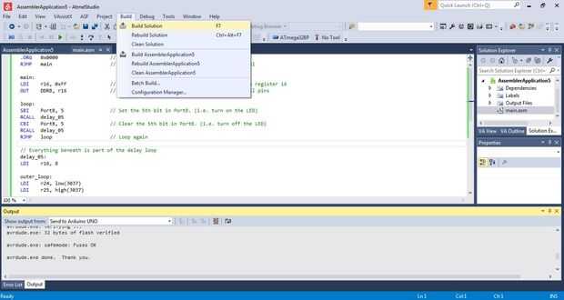 Esto hará que el integrado led de parpadeo de Arduino. Ahora haga clic en build/build solución y después de que ir a herramientas/enviar para Arduino UNO. Debería ver el parpadeo del LED de Rx/Tx y después de el integrado led empezará a parpadear. Y eso es todo, espero que has encontrado esta información útil. Ahora eres libre de utilizar Atmel Studio para hacer tus proyectos de Arduino.