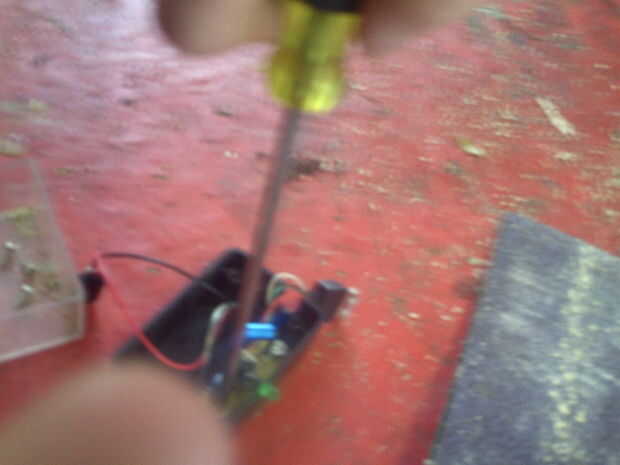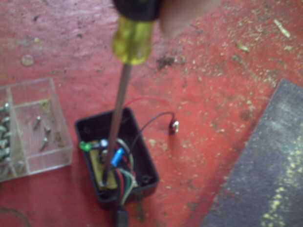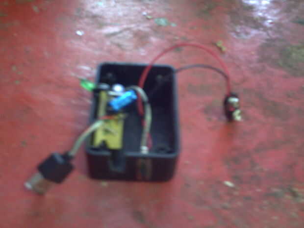 La pcb para el caso del tornillo o pégalo. A continuación pegamento caliente el led en el agujero que hiciste anteriormente. Luego pegamento caliente el usb enchufe en la ranura. Ahora poner la batería en el caso que debe encajar bien.