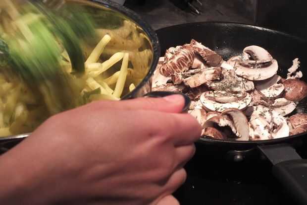 Añadir las setas, hierbas y sal. Saltear hasta que se doren durante 5-8 minutos.