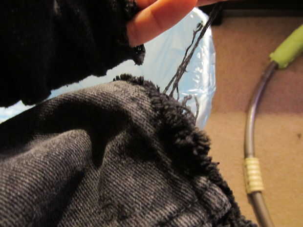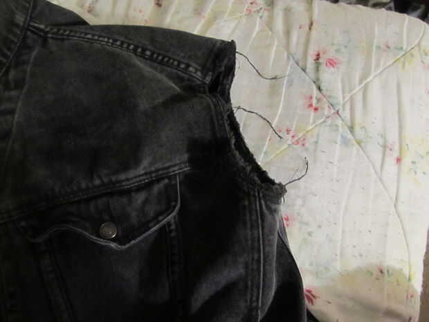 Luego tomar un cuchillo con dientes o un pedazo de papel de lija (no tener? ¿qué pasa con un monopatín? que funciona de la misma) y ejecutarlo a través de las costuras donde cortó las mangas, esto también le da un aspecto envejecido.