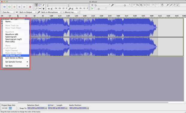 Ir a la parte superior izquierda de la pista de sonido y haga clic en el desplegable de la flecha al lado del nombre de la canción. Haga clic en "Dividir pista estéreo".