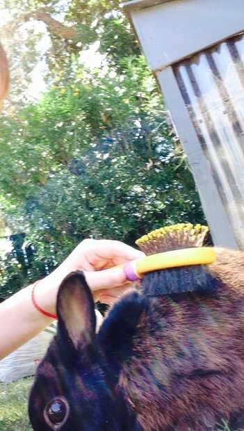 La razón por qué estoy usando el lado suave de la brocha y no el alambre, es porque ya que el conejo es corto pelaje, sólo necesita el lado suave para el cepillado. Primero Haz tu conejo, algunas pueden ser necesario en un bloqueado apagado espacio si son sonda para salir corriendo. Ejecute el cepillo hacia abajo tus conejos detrás y flanco, no sus muslos, piernas, brazos y cara. Suavemente la tapa en su parte posterior (algunos conejos pueden no quiere hacerlo!) y su estómago.