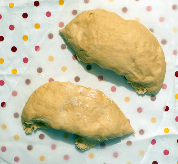 • Aplaste la masa. Retire la masa a una superficie ligeramente enharinada; dividir por la mitad.