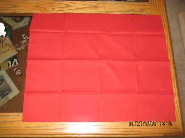 Ahora lo que hacen es tomar su paño rojo (mi madre decidió usar fieltro en su lugar después de que ya compró el paño rojo) y utilizar un recipiente como una plantilla. Usé un bol 7 pulgadas de diámetro. Utilizar cualquier tamaño que desee. Coloque su recipiente en el paño y use un lápiz para marcar alrededor de él. Una vez que corta este círculo, coser en la parte posterior de su chaqueta con el círculo con la mitad del círculo en azul, la mitad de la naranja. Si tiene problemas con esto, (no sé cómo, su tan simple) utiliza muchas imágenes de referance.