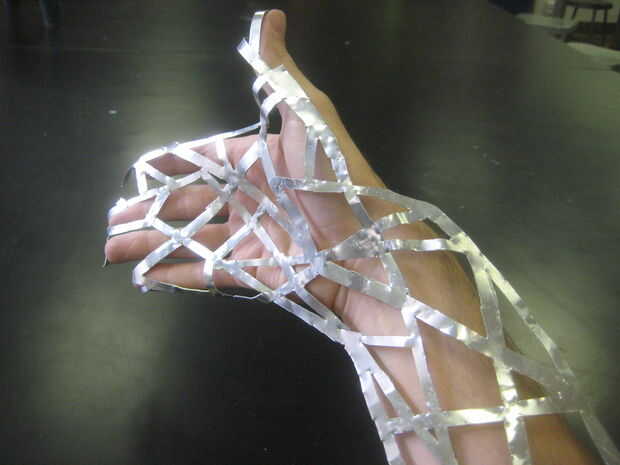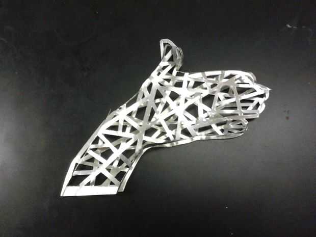 Lo impresionante acerca del uso intermitente de aluminio cincelado es que una vez que su diseño de corte, puede entonces doblar, forma y manipular muy fácilmente todo el objeto. En el ejemplo mostrado arriba, moldeado de la hoja a mi mano, entonces combinado con una hoja adicional, segundo, que sigue un patrón geométrico de la oposición.