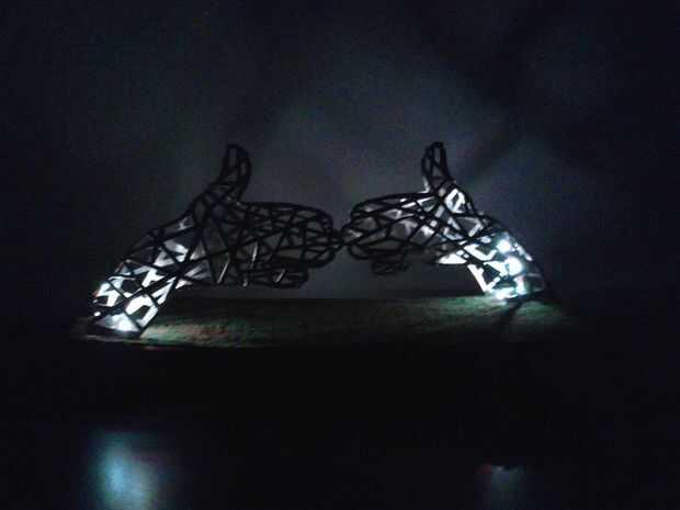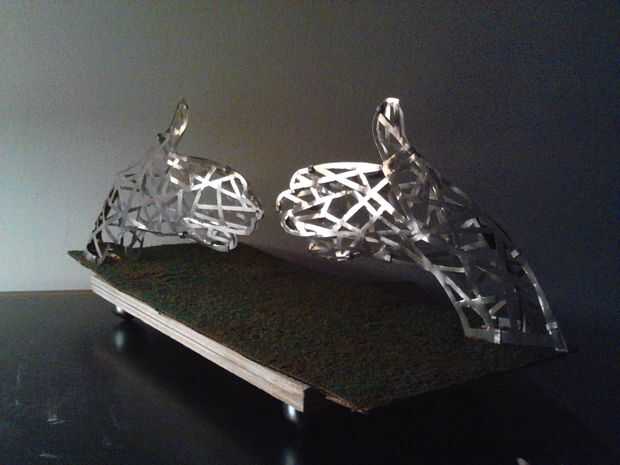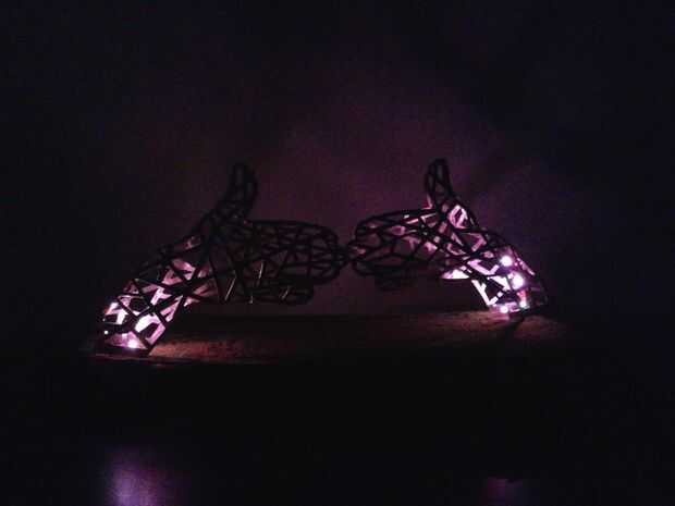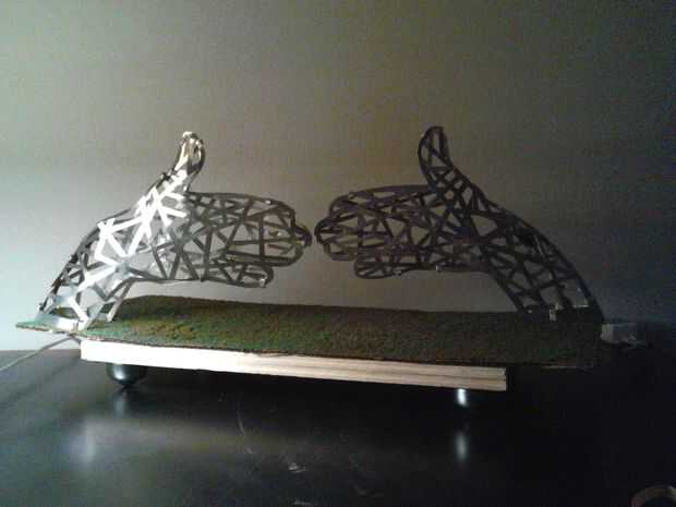 El ejemplo fue para una escultura pública en iluminación es un aspecto crítico. Así, el modelo, he añadido un sistema de ciclo LED para iluminar el interior de cada mano (cincelado 4 hojas y luego obligado a lo largo de los bordes con alambre). El video muestra cómo la luz afectará a las geometrías y las sombras.