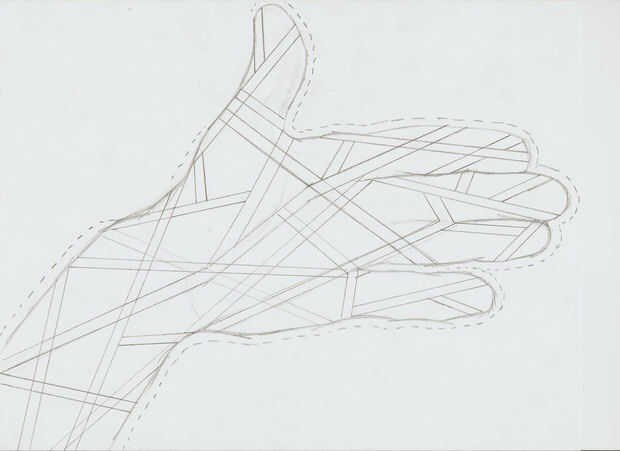 Aquí dibujé un lado de la mano, en que actualmente estoy trabajando. Que claramente marca-hacia fuera, con pesos pesados de línea de las bandas que formarán a pedacitos de aluminio "positivo" de la escultura. Los "negativos" espacios intermedios serán lo que cortamos. Se utiliza un cincel porque como se puede ver en el dibujo, el "negativos" espacios intermedios están rodeados completamente por los espacios "positivos" y no podrá ser cortado con tijeras.