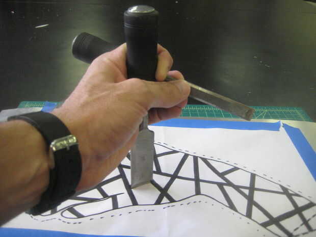Recuerde: Siempre sostenga el cincel vertical y perpendicular al pieza y corte mat. El borde biselado debe ser en el interior de su área de corte. Golpee con el mazo/martillo con buena presión hacia abajo. Martillo el cincel en un ángulo podría causar deslizamiento de la pieza o cambiar el diseño. Esto tiende a ser un ajuste acostumbrados a cincelar la madera, donde mirando los golpes son la norma.