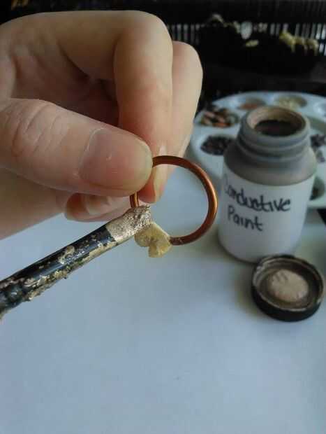Después de presentar a mi epoxi me gusta tomar mi dremel y usar el cepillo de nylon para obtener todo el polvo de mi anillo. No quiero entrar en mi pintura y contaminarla. Entonces tomo mi pintura y barniz conductor de cobre sobre el epoxi. Me gusta pintar un poco pasado el epoxi para que el cobre abrazos mis cristales muy bien. Algunas pinturas necesitan un poco de agua para diluirla para que puedas usar agua destilada para esto. La razón para utilizar agua destilada frente a grifo o purificados ya que puede tener agua purificada, pues las impurezas en ellos, vaya figura. Así que no quieres contaminar la pintura que a su vez sería contaminar la solución. No bueno. Me gustaria poner 2 capas de pintura, asegurándose de que la primera capa esté completamente seca antes de añadir al segundo. Dejar secar totalmente antes de pasar. Esto toma un par de horas.