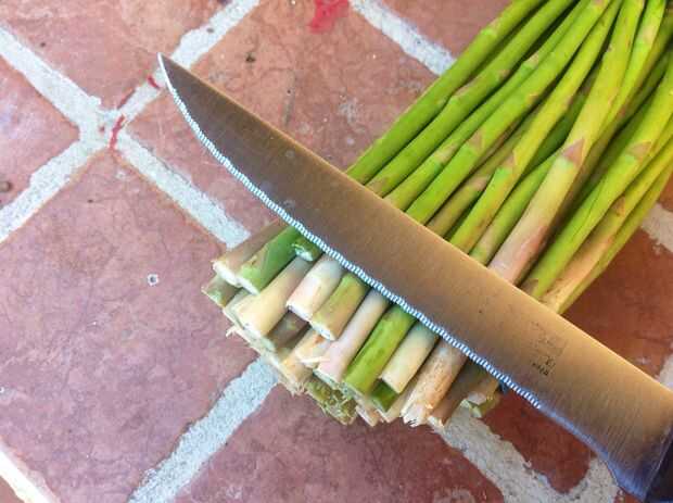 Cortar los extremos marrones de los espárragos y colocar en la cacerola
