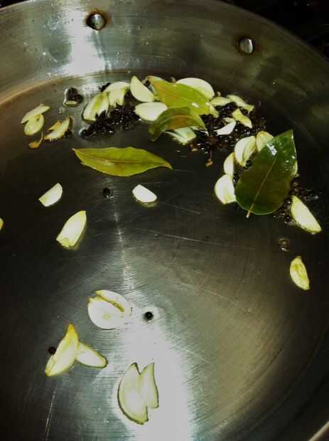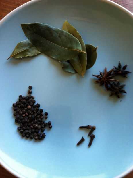 Establecido todo especias, vinagre y salsa de soja. Calentar una sartén grande (que tiene una tapa) a fuego alto con aceite de oliva, dejando la tapa por ahora. Añadir el ajo y las especias enteras; granos de pimienta, anís estrellado, hojas de laurel y clavo de olor. Tostar especias hasta que los granos de pimienta negra pop. Añadir carne y marrón también. Una vez la carne aparece a dorar, agregue cebolla, pimienta de Jamaica, pimienta blanca, vinagre y salsa de soja y azúcar.