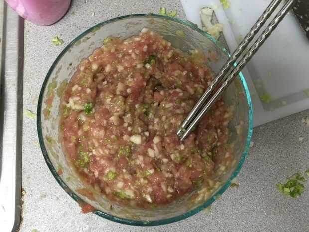Poner la carne de cerdo picada, col shreded y setas en una bastante grande del tazón de fuente y usan el chopticks mezclarlos en la misma dirección (hacia la derecha o hacia la izquierda) por 1 minuto. Poner salsa de soja sal y 15g 25g en el relleno y mezclar por 1 minuto. El tiempo de la mezcla debe ser uniforme, o algunas de las bolas de masa hervida cocidas serán demasiado salada y algunos carecen de salado.