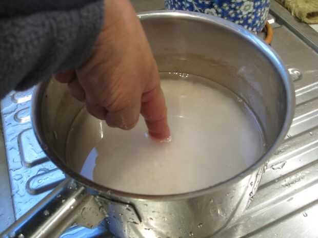 Pon tu dedo medio en la cacerola hasta que toque el fondo y coloque en agua o caldo hasta que el nivel llegue a la segunda línea de su dedo.