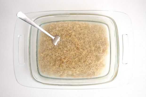 Combinar el arroz, agua, aceite y sal en la cazuela y remover todo.