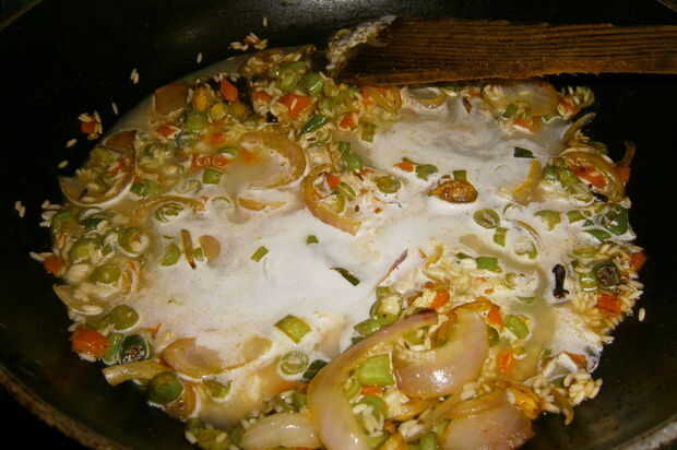 Añadir 1 taza de leche de coco y 1 taza de agua y sal. Hervir a fuego medio.