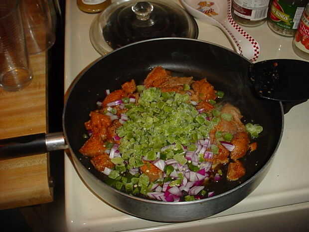 Ahora en la cebolla picada, pimientos, ajo y condimentos envasados, revolver y cocinar por unos minutos