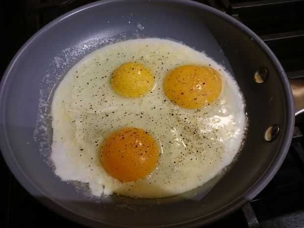 Crack 3 huevos y añadir a la sartén sin pasarse cualquier yemas. Usando la esquina de la espátula, romper la membrana mantiene el blanco juntos. Después de baje el fuego a medio bajo y medium(1/4). Luego agregar sal y pimienta uniformemente en los huevos (ver fotos, tanto sal como de pimienta). Con la esquina de la espátula, pop las burbujas que formato durante la cocción