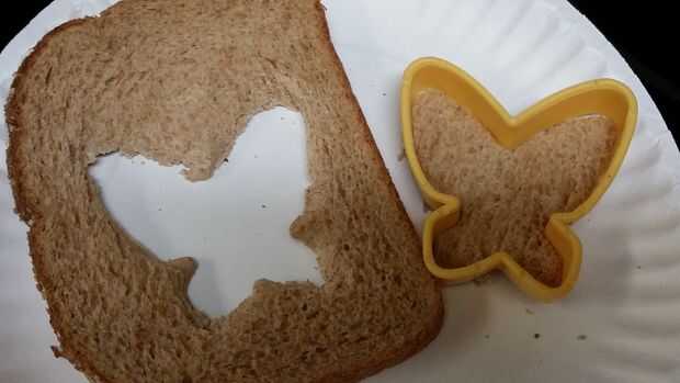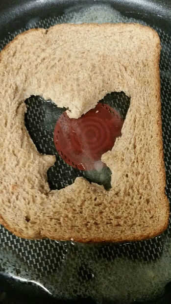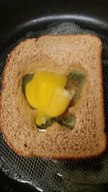 Agarra tu cortador de la galleta y corte la forma hacia fuera en el centro de la rebanada de pan (si no está usando una lágrima sólo cookie cutter un agujero en el pan) Coloque el pan en el pan y el huevo en el agujero de la grieta. En este punto puede romper el yugo o no. Me gusta a mi.