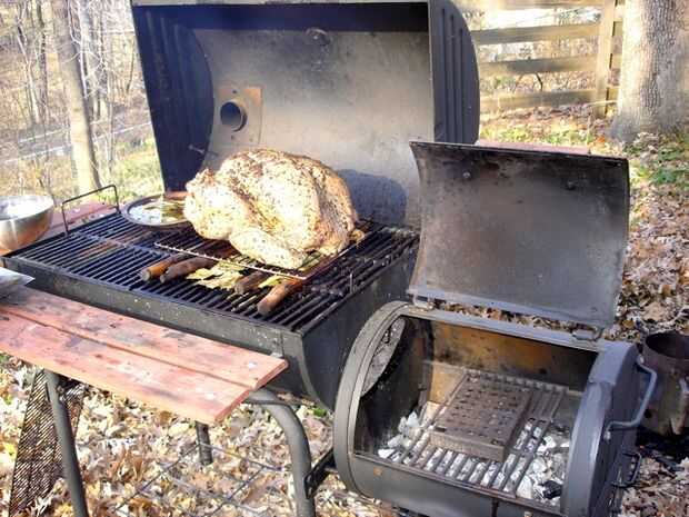 Coloque el pavo marinado en la parte superior los madera palos de pimiento. Puede utilizar una parrilla de alambre por debajo de Turquía para facilitar el paso y hacer girar más adelante.
