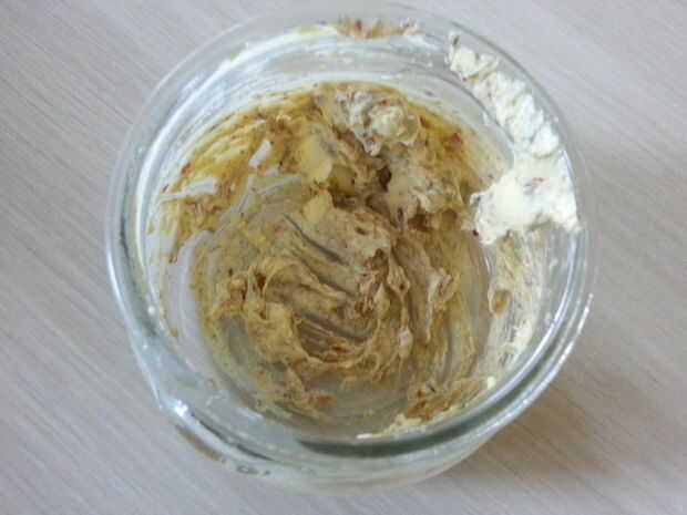 Tome la cantidad deseada de mantequilla y se deja suavizar en temperatura ambiente. Cuando esté suave agregar las especias que desee (lo prefiere rojo pimienta, tomillo y comino). Deja la mezcla enfriar en la nevera.
