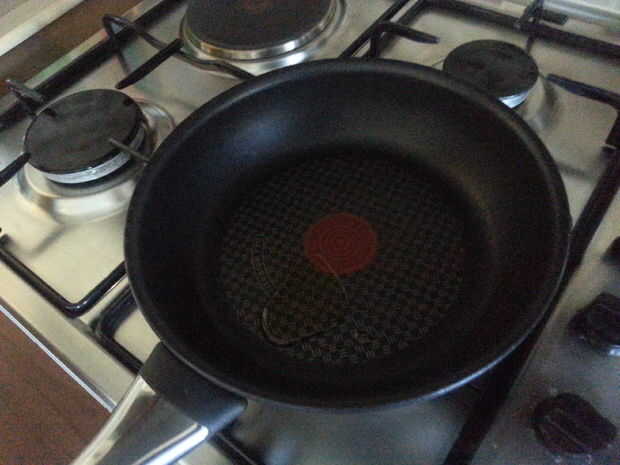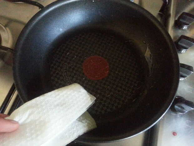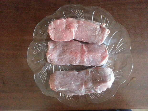 Tomar la carne de la leche y poner lo en un plato dejó permanecer allí durante 5 minutos: exceso leche va a salir. Luego agregue pimienta negra y sal. Un poco aceite de oliva a la sartén y con la ayuda de un papel de tejido Asegúrese de cada parte está civered con aceite.