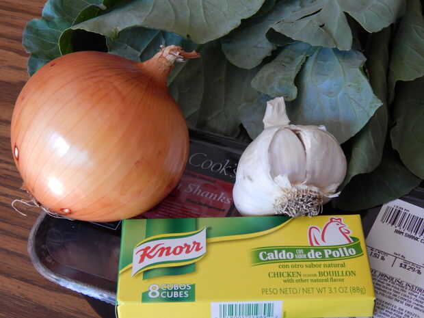 Cortar la cebolla y póngala a un lado. Conseguir un helicóptero pequeño ahorra mucho tiempo. Hacer lo mismo con el ajo. En una olla añadimos en los cubos de lingotes, la cebolla picada y el ajo que es picada. Cubierta de la cacerola con agua apenas suficiente para cubrir la caña del jamón, agregar los condimentos y caliente baja a fuego medio.