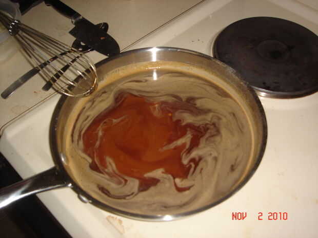 4.) revuelva constantemente hasta color chocolate oscuro, tenga cuidado de no quemar, quemar se indica con puntos negros.