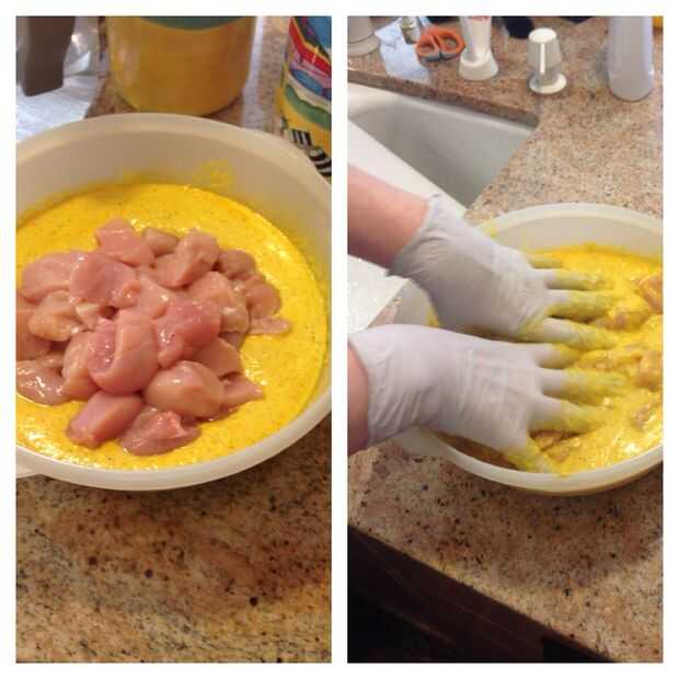 1. Sumerja todos los trozos de pechugas de pollo en la marinada. Asegúrese de mezclar cada trozo para que el Adobe completamente los abrigos.