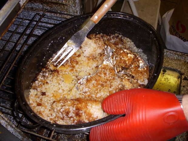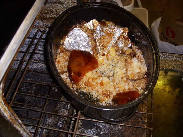 Sal saturada con grasa de carne de res no es algo que usted quiere poner el fregadero de la cocina. La sal que estaba debajo de la bestia será una masa sólida de material compuesto de sal o grasa capaz de dar hormigón un funcionamiento para su dinero en el Departamento de la fuerza. Cuando es el momento de limpiar, poner la bandeja en un horno bajo (250 F) al calor y ablandar la grasa y parcialmente disolver la sal en jugos. Entonces romper la masa con una herramienta adecuada y volcado en su bolsa de residuos sal triple capa.