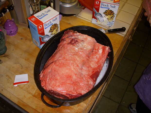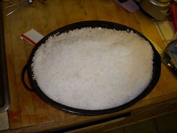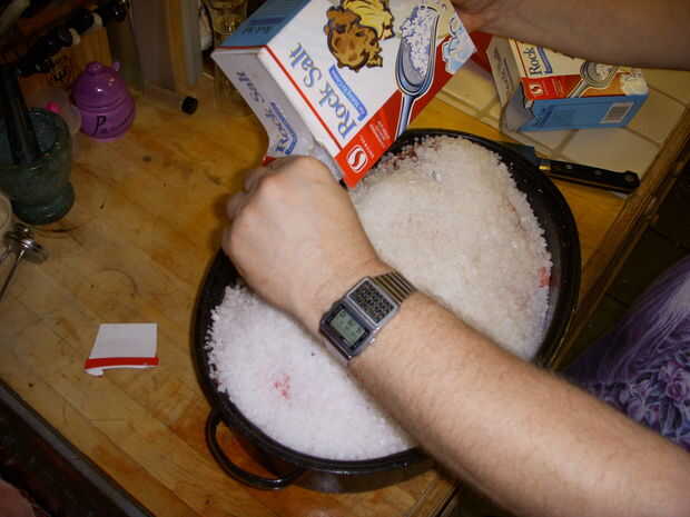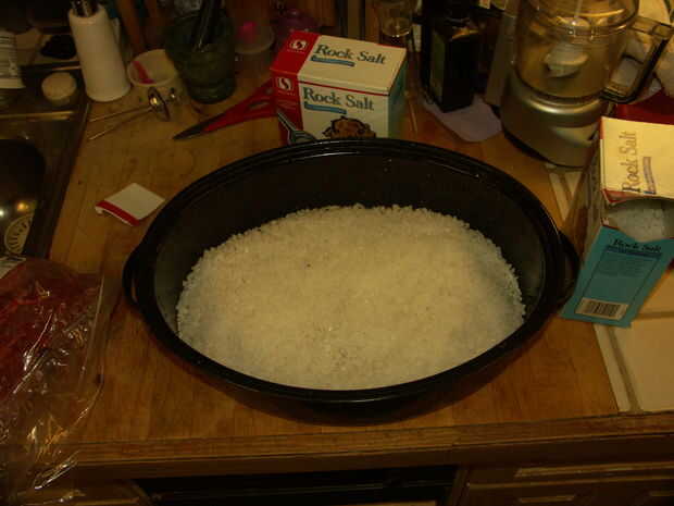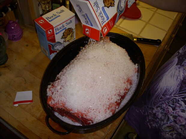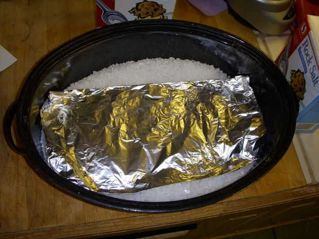 Poner una capa de sal (aproximadamente una pulgada de profundidad) en el fondo de la olla, poner la carne encima de eso y añadir más sal de la roca para enterrarlo esencialmente. Puede agregar papel de aluminio sobre las secciones carnoso si le preocupa la cantidad de sal que va a terminar en la carne, pero como las especias, no que mucho penetrará muy lejos en la carne de todos modos; sobre todo la sal poco sella en la humedad y permite espacio de drenaje de grasa. Generalmente uso una capa de papel de aluminio si tengo un asado sin hueso con carne desnudo expuesto.