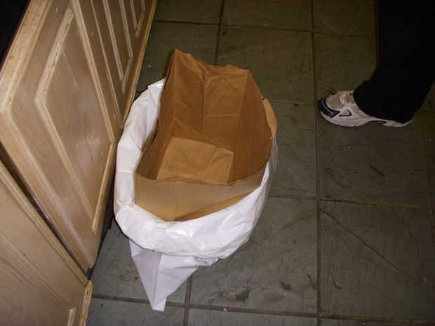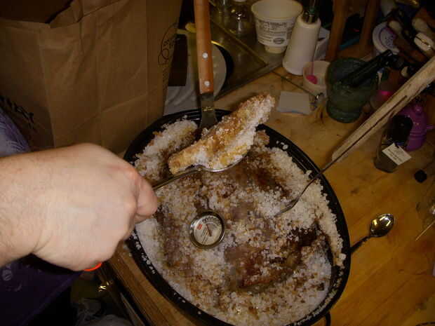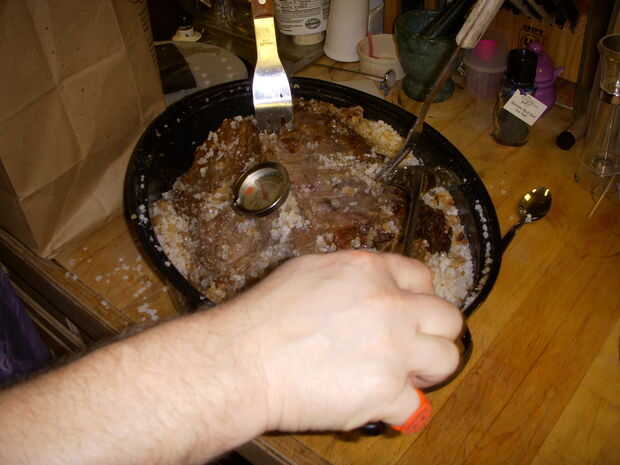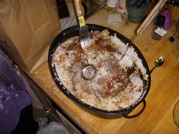 Retire con cuidado la sal de la parte superior y los lados de la carne, ponerla en algún lugar donde no van a hacer demasiado daño. Usar una bolsa de papel doble dentro de una resistente Bolsa de plástico (compactador de basura). El papel es bastante resistente al calor, y el plástico no escaparán grasa o grasa. Cuidado; está todavía caliente. Desea eliminar suficiente sal de la parte superior y lados que usted puede levantar a la bestia sin dispersión demasiada sal caliente todo en todas partes. (es casi toda la sal de la parte superior y los lados).