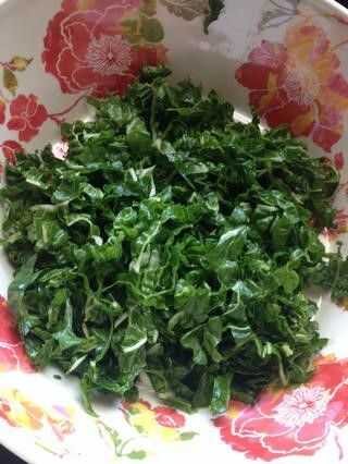 4. Picar las acelgas en trozos relativamente pequeños, como se muestra en la imagen, pero no es necesario cortar demasiado pequeño, porque en el paso de la agitación, se romperá en pedazos más pequeños usando el agitador.