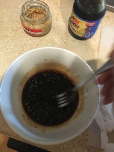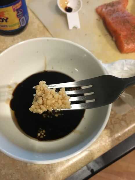 -Combine la salsa de soja, jarabe de arce y ajo picado en un tazón pequeño.