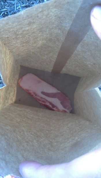 Comienzo cortando unas tiras de bacon por la mitad. Luego tome una mitad de una tira de tocino y colocar dentro de la bolsa. Luego frota alrededor en el interior de la bolsa para saturarla. La grasa debe sangrar a través de la bolsa un poco más, asegurándose de que satura completamente los lados y la parte inferior.