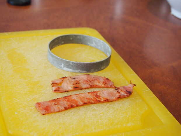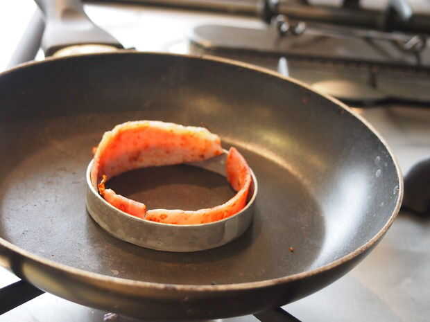 Ok, así que sacar el tocino de la sartén y ponerlo en el interior del anillo del huevo.