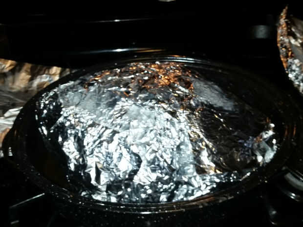 C) sello de la tapa con otra capa de papel de aluminio (como se muestra) y coloque la tapa de la olla asado sobre.