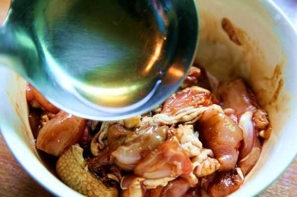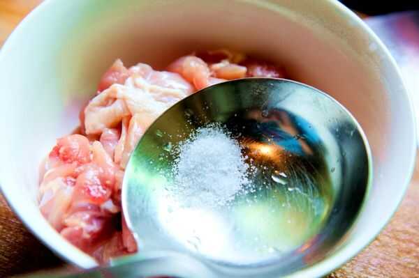 - Añadir 2 gramos de sal, 5ml de vino, salsa de soja oscura de 5ml, 10 ml de agua y 10 gramos de almidón de cocina en el pollo.