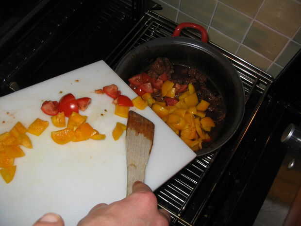 cuando han pasado 2 horas, abrir el horno añadir el tomate y el pimentón. una vez más, la tapa es realmente muy caliente, así que quizá quieras agarrar una toalla primero. después de agregar el pimentón y el tomate, revuelva un poco, colocar la tapa en y poner el cronómetro en 1 hora. todavía tienes que revolver cada 20 minutos.