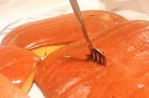 Voltee la calabaza para que sea parte de la piel para arriba y lo tostamos durante unos 45-60 minutos. El tiempo de cocción varía dependiendo de tu horno y el espesor de la calabaza, así que mantener un ojo en él. Cuando la piel vuelve un naranja oscuro y fácilmente se puede pinchar con un tenedor, se hace.