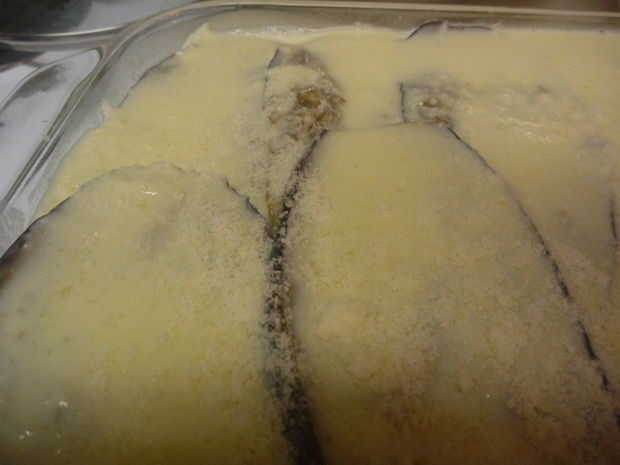 6. agregar la salsa de carne encima de las berenjenas y espolvorear con abundante queso parmesano.